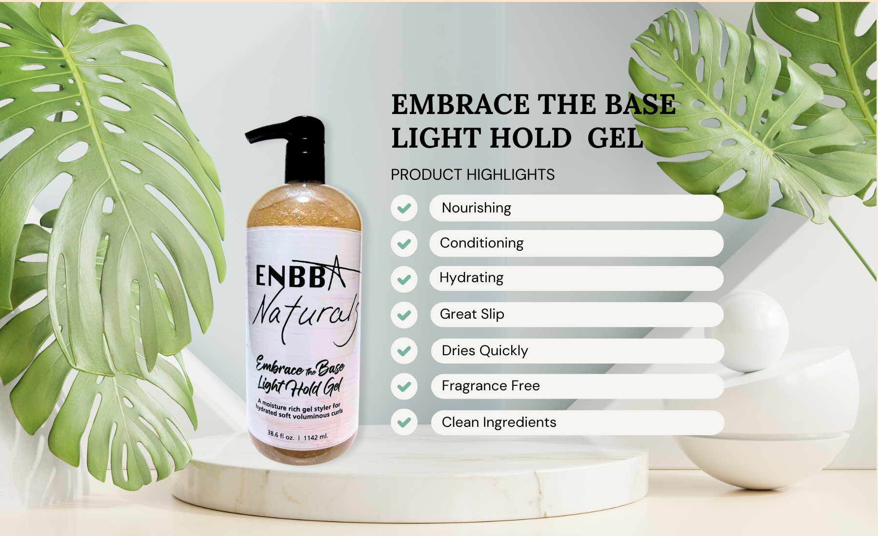 After cleansing and conditioning, apply a leave-in conditioner to wet hair in sections, followed by the base gel. Start with one pump per section. Pump directly into the palm of your hand, emulsify before applying in sections to soaking wet hair. If hair does not hold onto water on its own, apply the first pump of the gel along with water added directly to the palm of hand and mix together. Follow with recommended products to balance hydration, increase elongation, add fullness and extend longevity of the style.